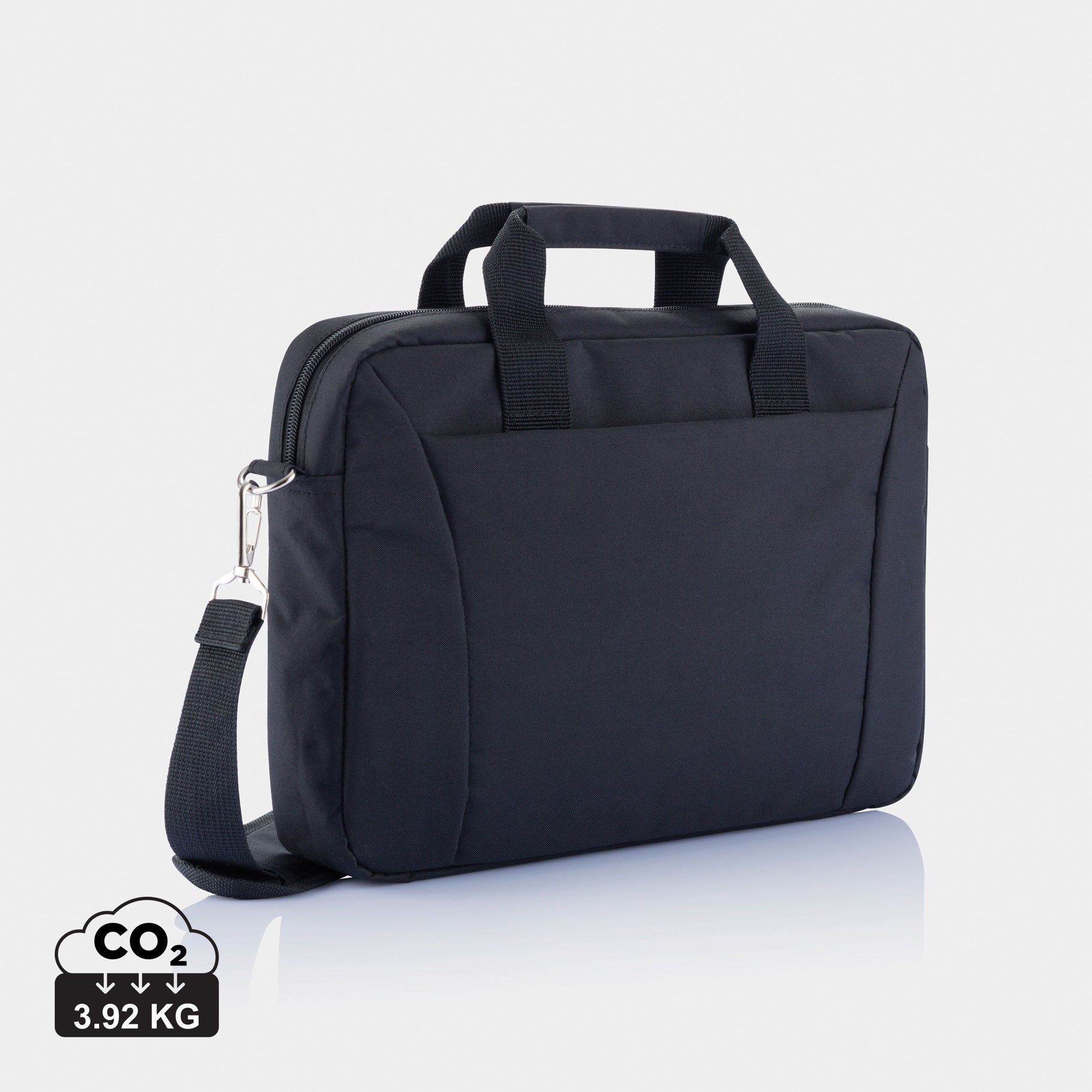 300D polyester laptop bag which is ideal for lightweight travelling. It has all the pockets you need, 15.4” laptop compartment, space to put your papers and a trolley sliding system. PVC free.