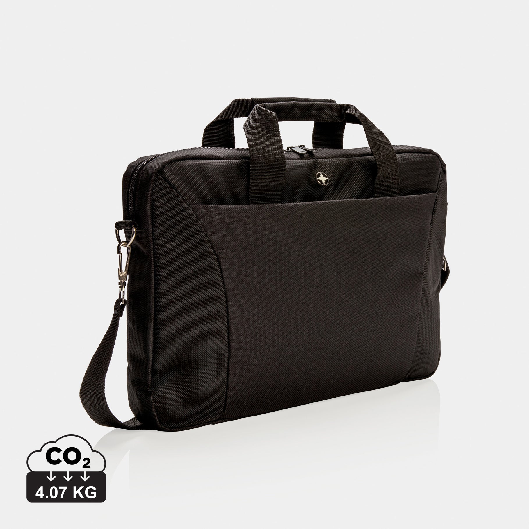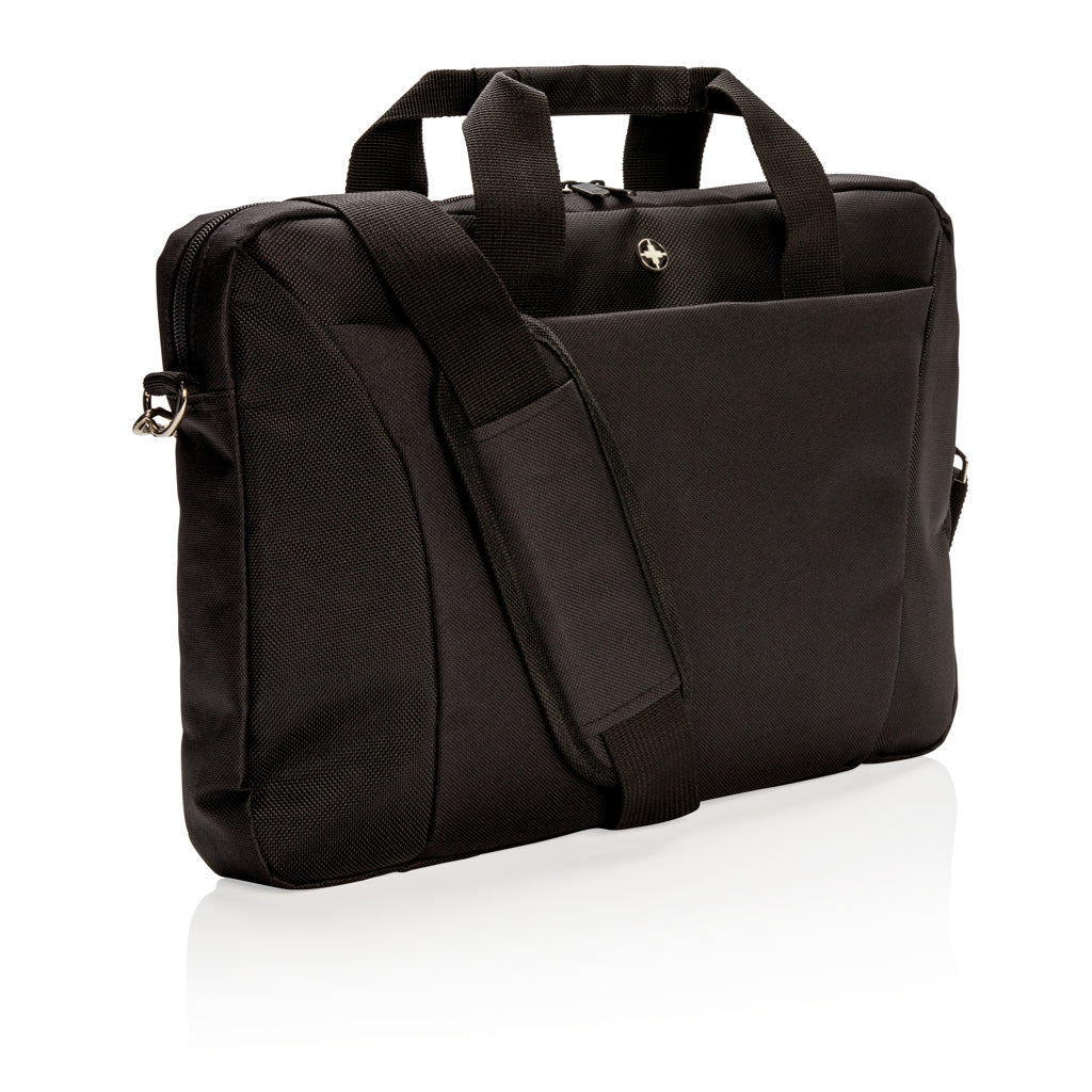 Carry your 15.4” laptop to and from work inside this slim 600D with 1680D polyester laptop bag from Swiss Peak. Includes a padded pocket for your laptop, a separate pocket to hold your iPad or tablet, and a front zippered extensive organiser with pen sleeves and pockets to hold all of your small accessories. Also comes with a rear luggage opening that can be slid over the handle of your upright rolling suitcase. Versatile carrying options with the adjustable & detachable shoulder strap. PVC free.