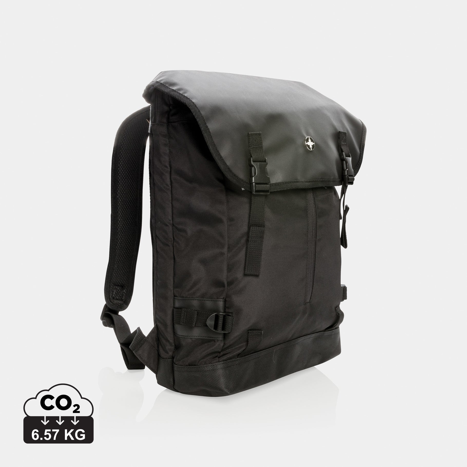 Comfortable and stylish flapover 17” laptop backpack. This lightweight yet durable backpack features super-sleek, vertical styling and flapover construction. It comes with a padded laptop computer sleeve, a padded tablet or eReader sleeve, and accessory front pockets. Its vertical front zip pocket offers additional storage space. Padded adjustable shoulder straps and a padded back panel for extra carrying comfort. PVC free