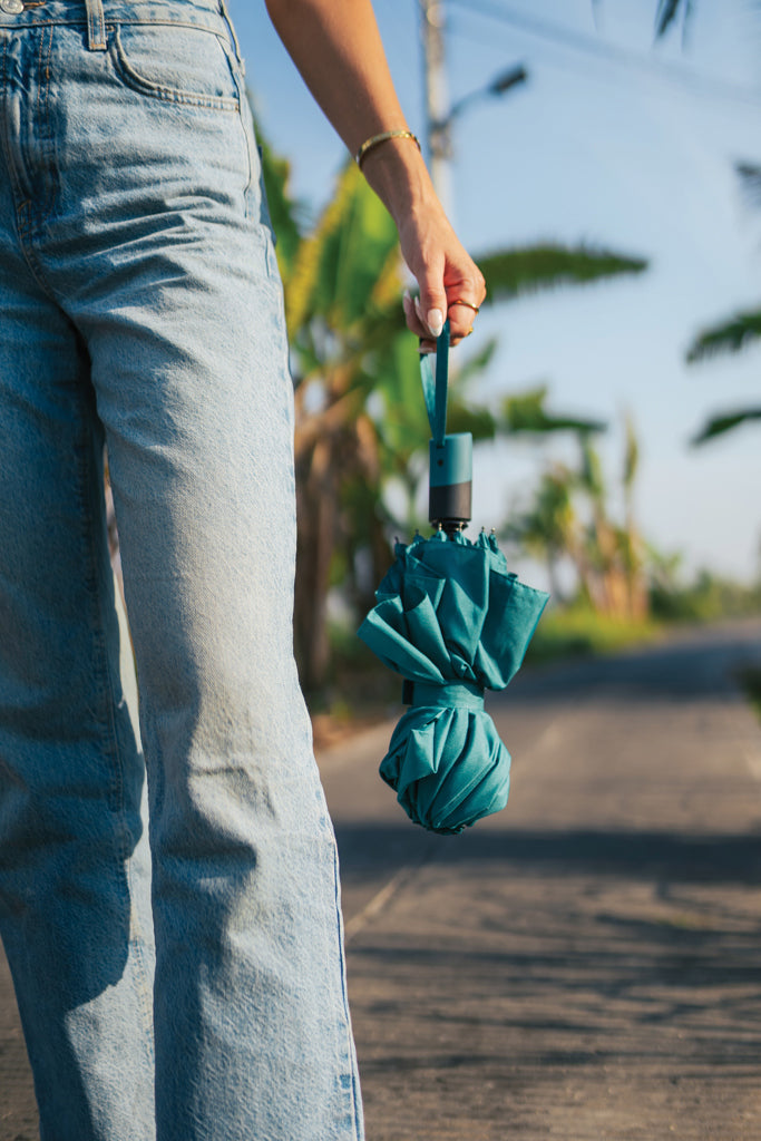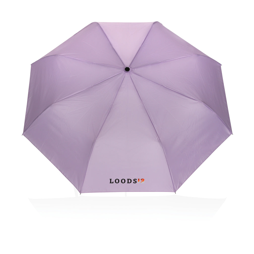This portable 3 section auto open open mini umbrella is the perfect size to keep in your bag or car for a weather emergency. Metal frame, fibreglass ribs with ABS handle. With AWARE™ tracer that validates the genuine use of recycled materials. This umbrella canopy is made of 7.7 PET bottles (500ml). 2% of proceeds of each Aware™ product sold will be donated to Water.org.