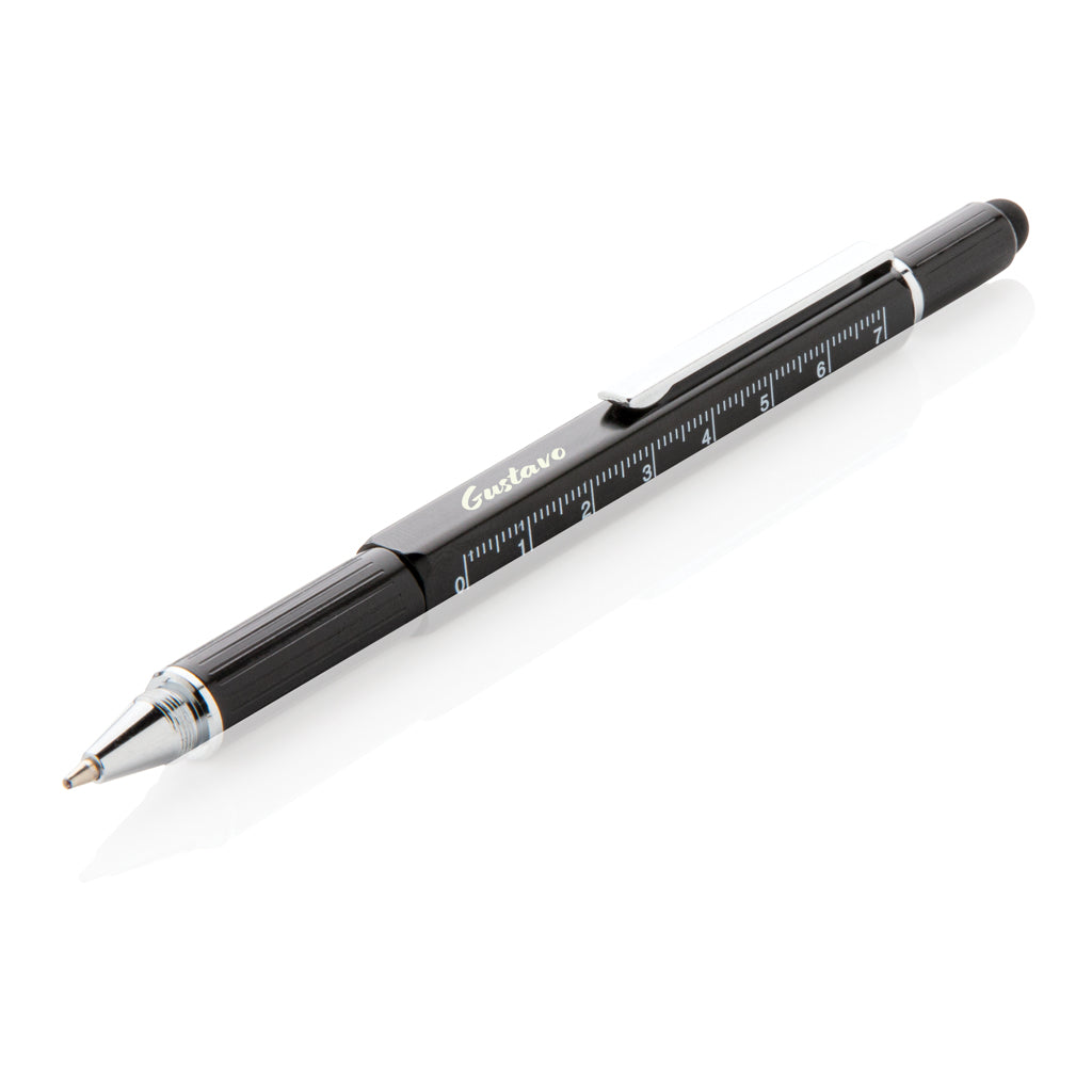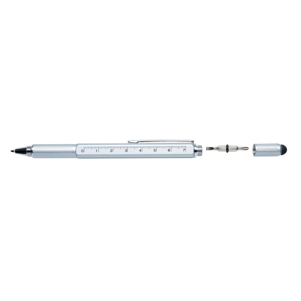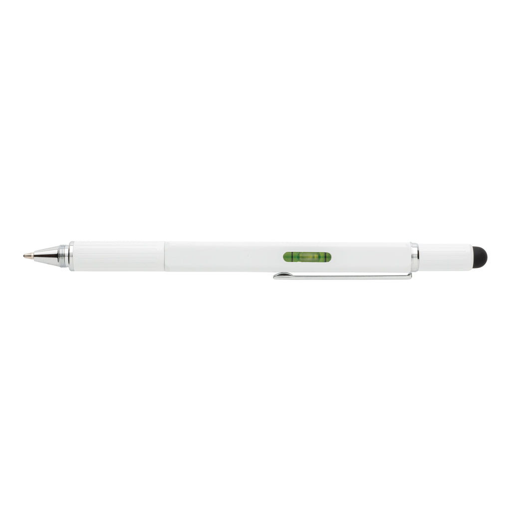 Multifunction pen with ruler (7cm) , spirit level, screw driver, stylus tip and ballpoint with blue writing ink (up to 400m) Made out of high quality brass material with aluminium clip.