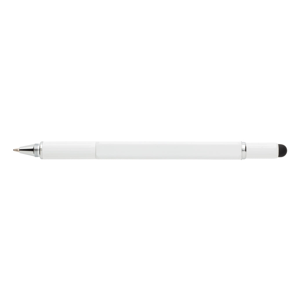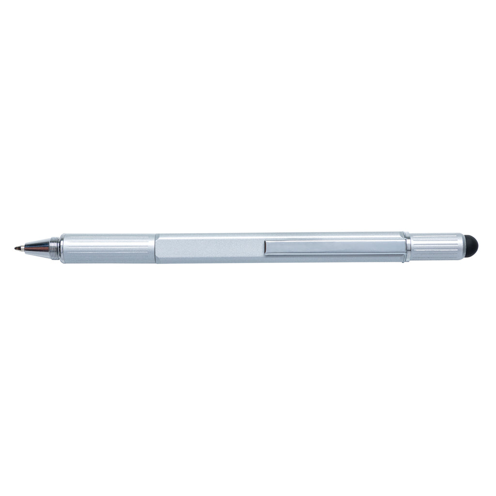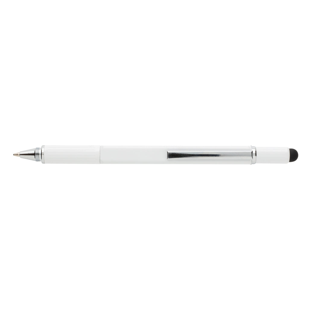 Multifunction pen with ruler (7cm) , spirit level, screw driver, stylus tip and ballpoint with blue writing ink (up to 400m) Made out of high quality brass material with aluminium clip.