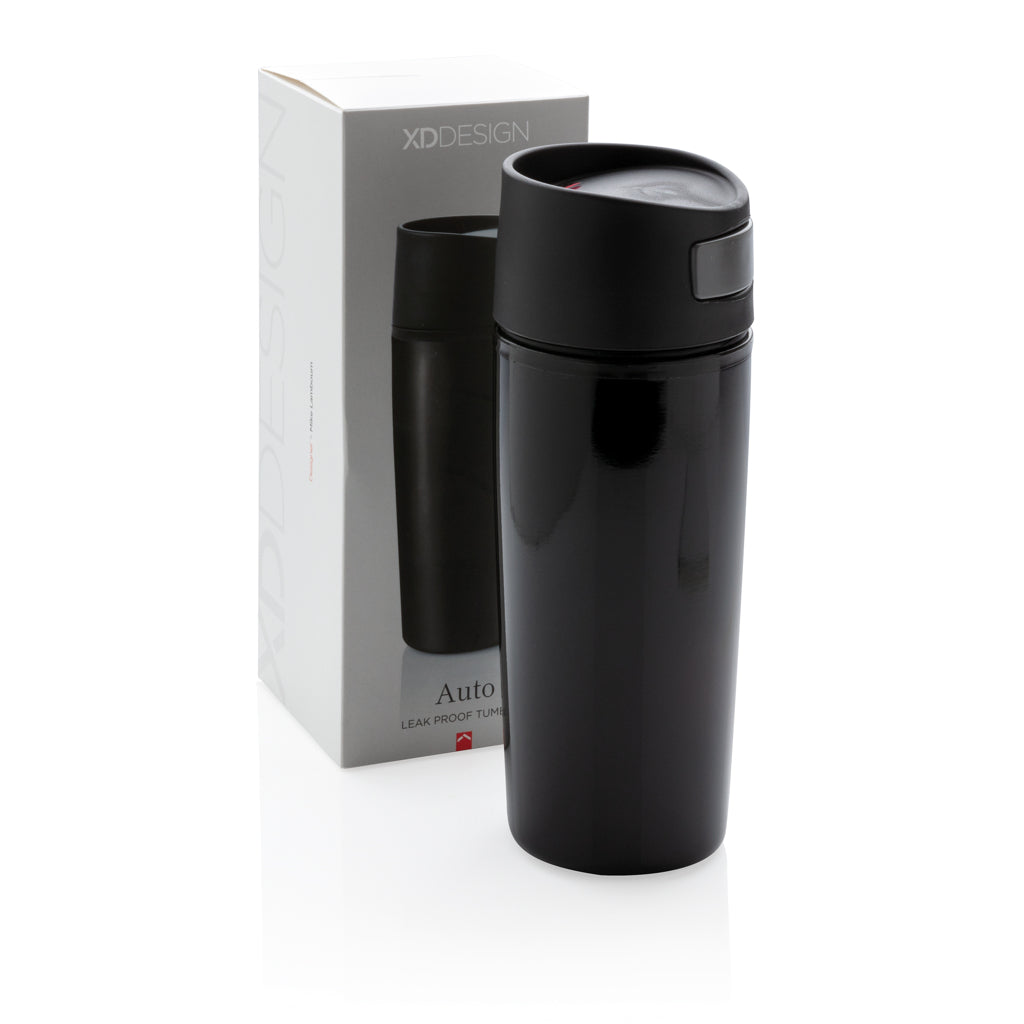 Auto is a 300ml tumbler with black PP coating and an innovative push system which allows you to control it with only one hand. Ideal for in the car. Registered design®