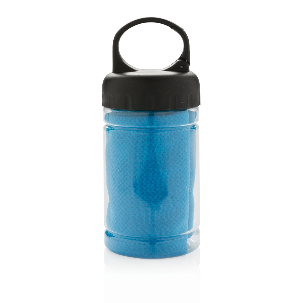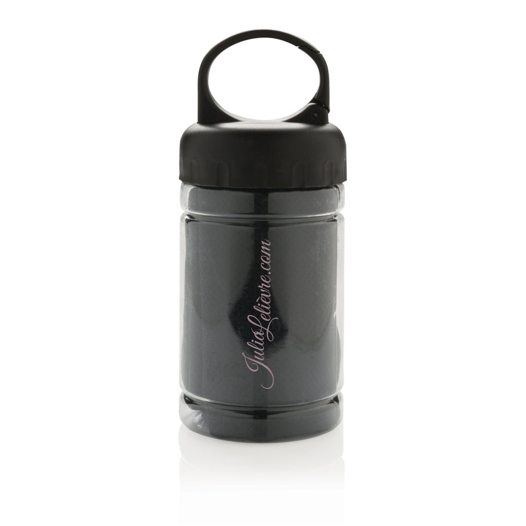 Microfibre cooling towel 100% free of chemicals. 98% sun blocking function up to UV 50+ protection. The towel can be easily used by adding some cold water to the bottle creating a cool towel for fast refreshment. The bottle is made out of PP with ABS top and carabiner to take along on outdoor activities. 77 x 30cm.