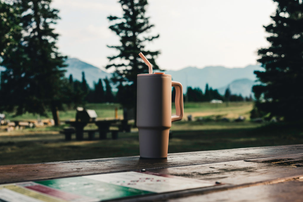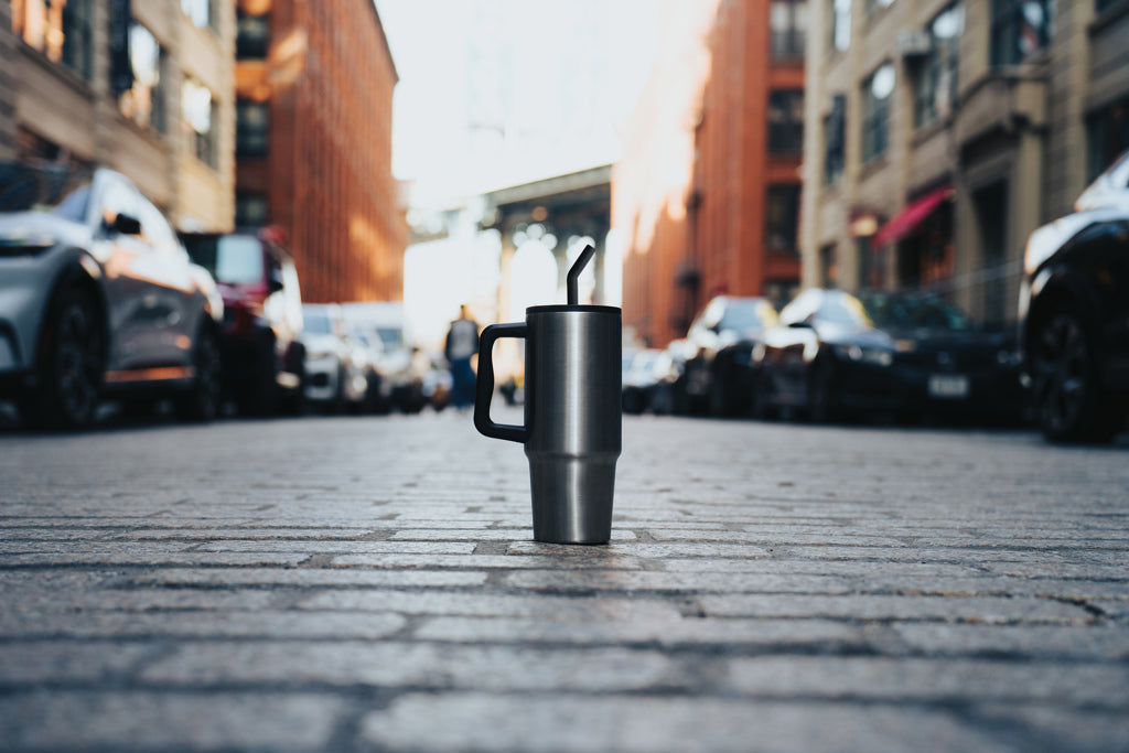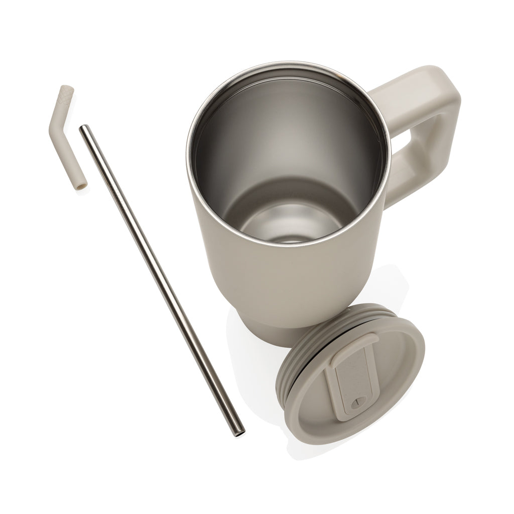 Experience the spacious yet conveniently portable embrace of our generously sized tumbler – not too big, not too small. Its comfort-grip handle and slim base make it a perfect fit for most cup holders, ensuring you stay refreshed whether you're enduring a long day of meetings, conquering a rowing class, or embarking on a trip out of town. Crafted from durable recycled stainless steel, this 900 ml. tumbler rises to the hydration challenge. This double-walled, vacuum-insulated tumbler comes complete with a spill secure lid, recycled steel straw, and a silicone straw tip. The screw-on lid boasts a dual function, offering a convenient drinking spout or the option to use a straw. We recommend handwash. RCS certification ensures a completely certified supply chain of the recycled materials. Total recycled content: 70% based on total item weight. BPA free.