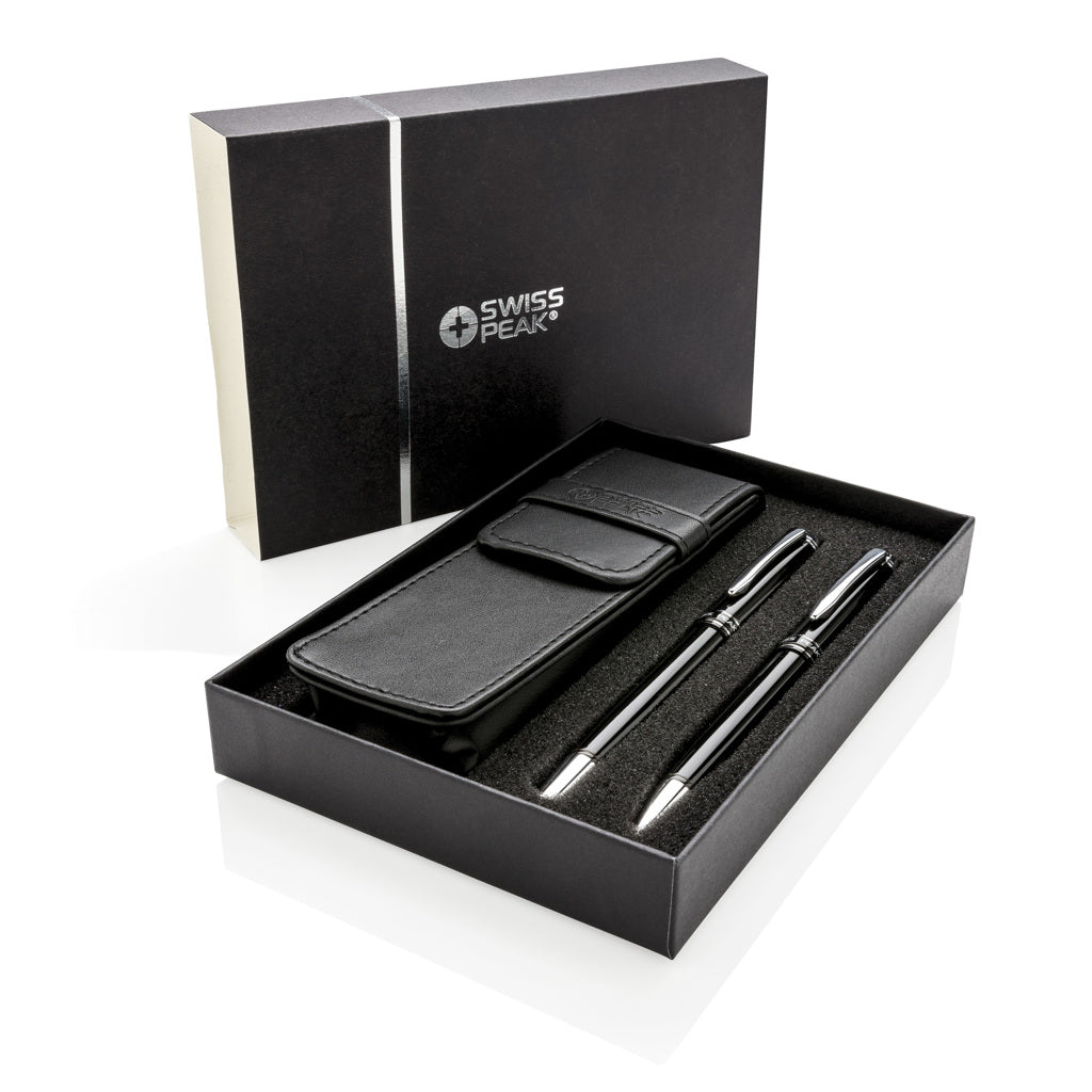 Authentic pen set bearing all the hallmarks of classic quality. High quality heavy brass metal rollerball with stylus and ball point pen with Swiss Peak branding. Including premium PU leather pouch and giftbox. Blue ink.