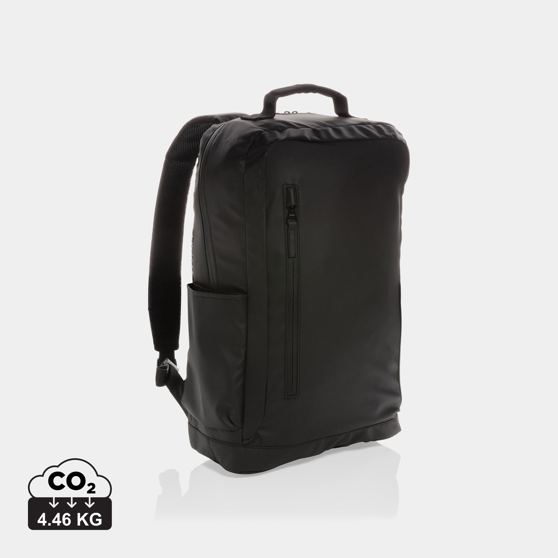 Look effortlessly stylish when carrying this all black laptop backpack. This bag holds a roomy compartment for all your gear and a laptop compartment that can hold a 15.6" laptop. PVC free.
