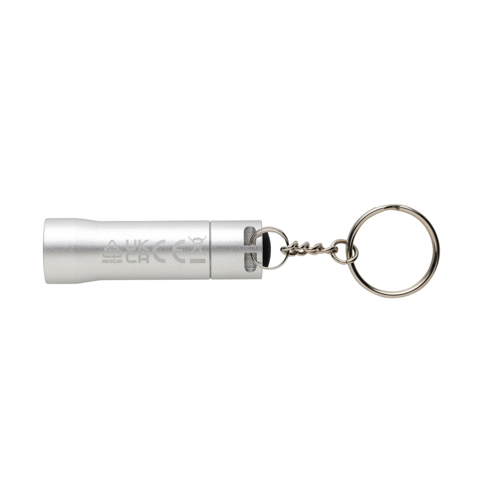 3 LED pocket size torch made with RCS recycled aluminum Total recycled content: 50% based on total item weight. RCS certification ensures a completely certified supply chain of the recycled materials. With 15 lumen that allow an operating time up to 6 hours on one set of batteries (included) With keychain. Beam distance: 3 metre. Packed in FSC® mix kraft packaging.