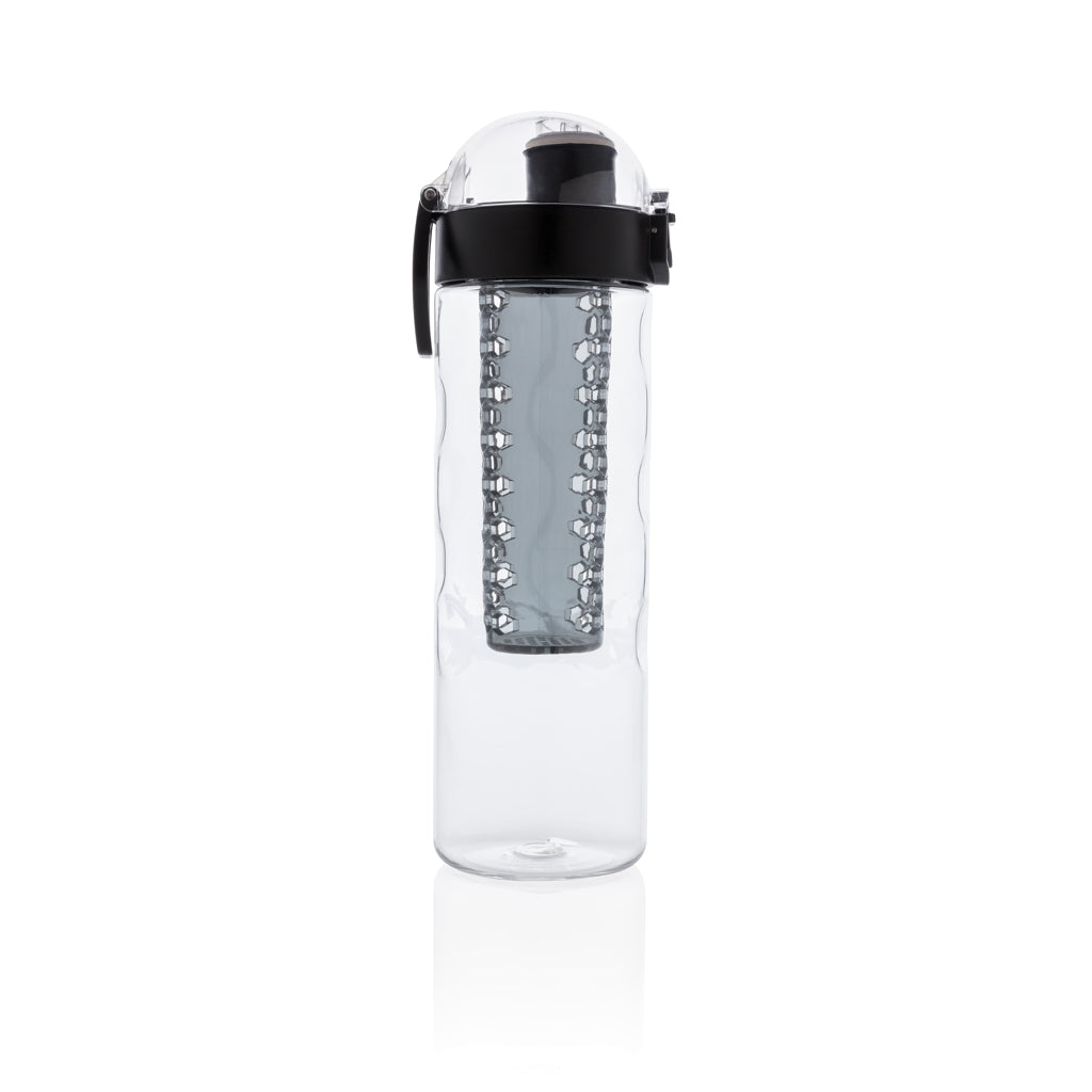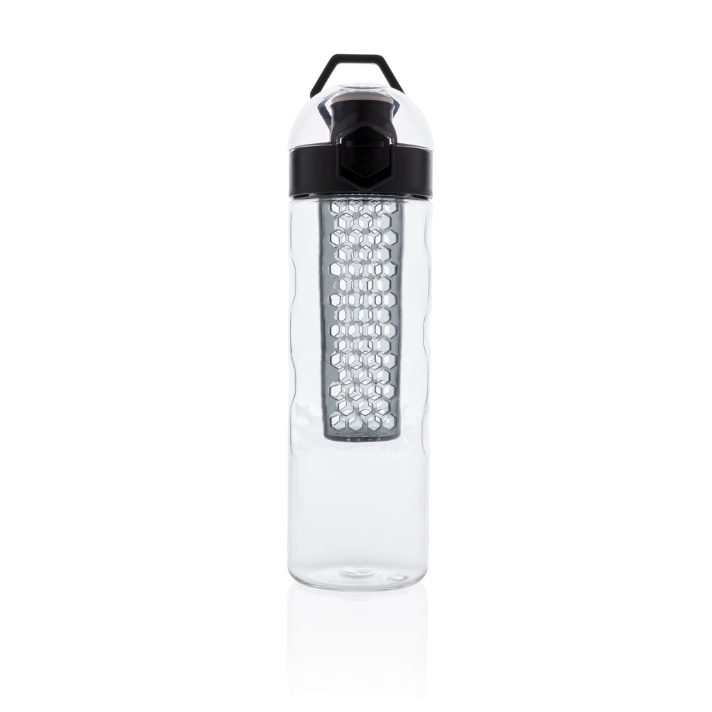 Add some healthy fruit flavours to your water. This design bottle with honeycomb details offers convenient single-handed drinking. Push the button and the lid flips open. There’s a special locking mechanism to keep users from accidentally pressing the button. Including carrying handle. This infuser bottle is made of a durable and innovative tritan material . Odourless and 100% BPA-free. Content 700ml. Registered design®