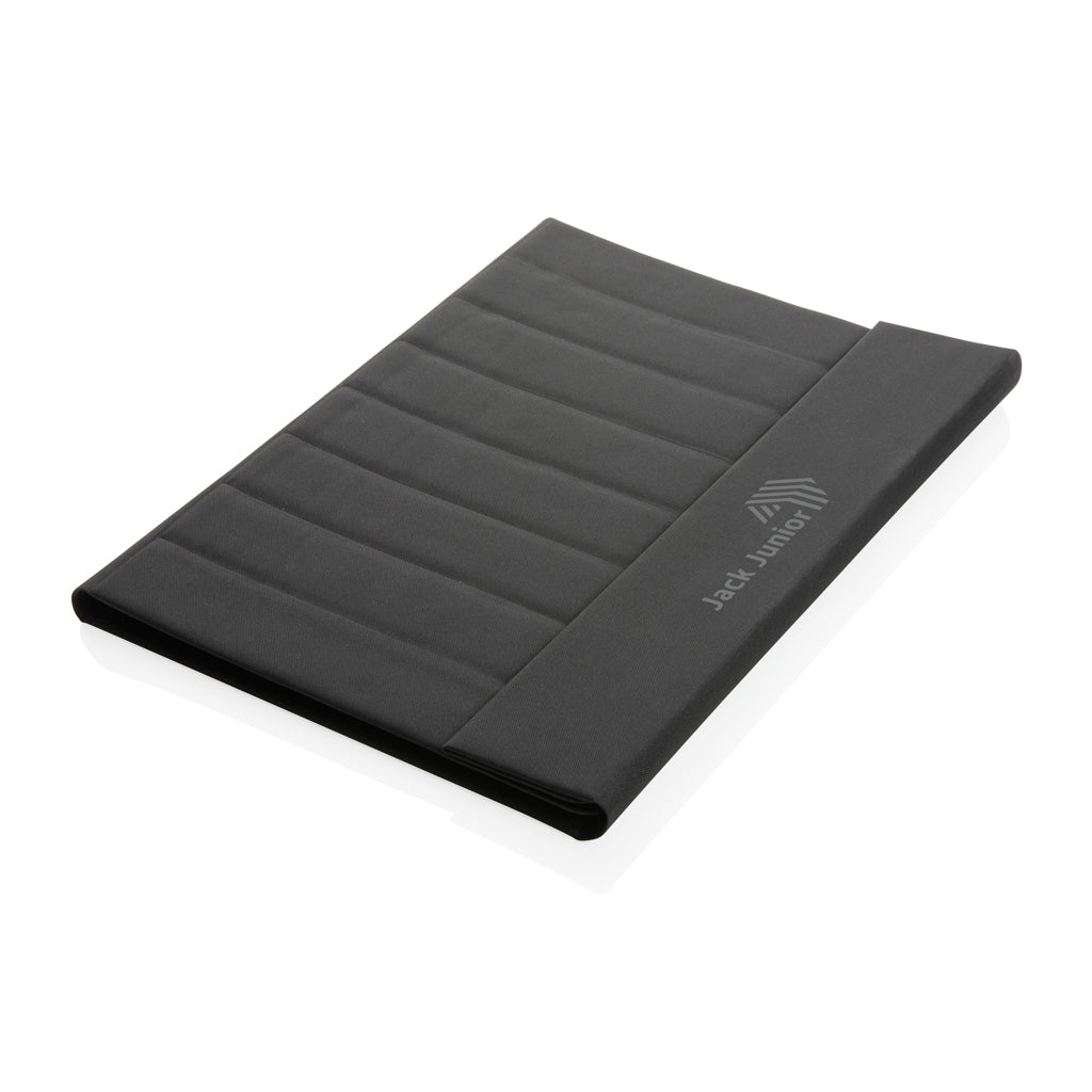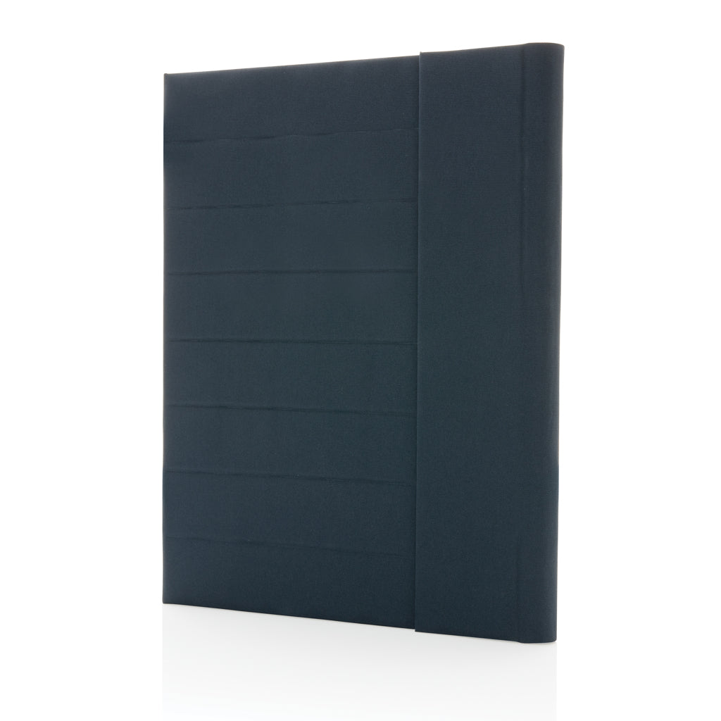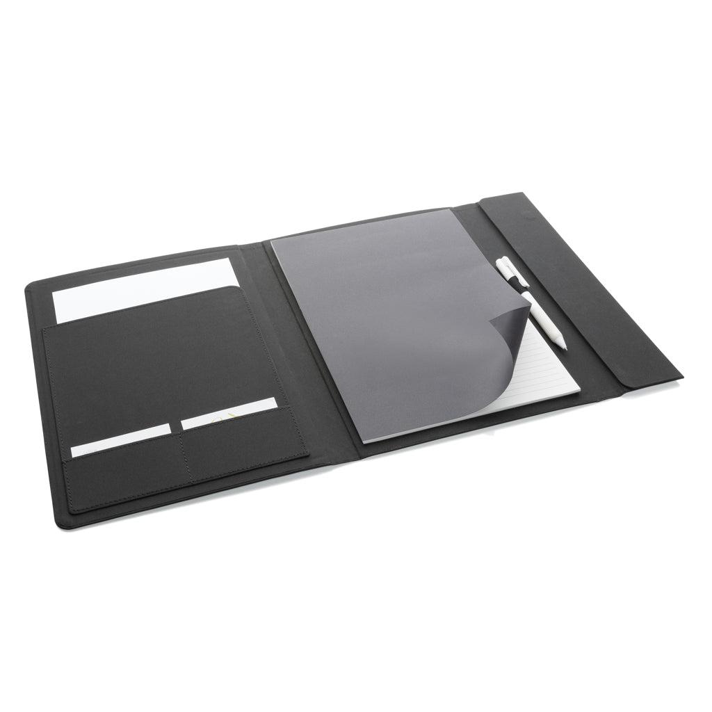 Keep all your work essentials organised with this beautiful A4 Aware™ RPET portfolio with magnetic closure. Inside you will find 1 big sleeve pocket, 2 additional pockets and a pen loop. Including FSC recycled paper notepad. The notepad contains 20 sheets cream coloured lined 70gm/s recycled paper. Interior and exterior 100% recycled polyester. With AWARE™ tracer that validates the genuine use of recycled materials. Each portfolio has reused 3.2 0.5L PET bottles. 2% of proceeds of each Impact product sold will be donated to Water.org. PVC free.