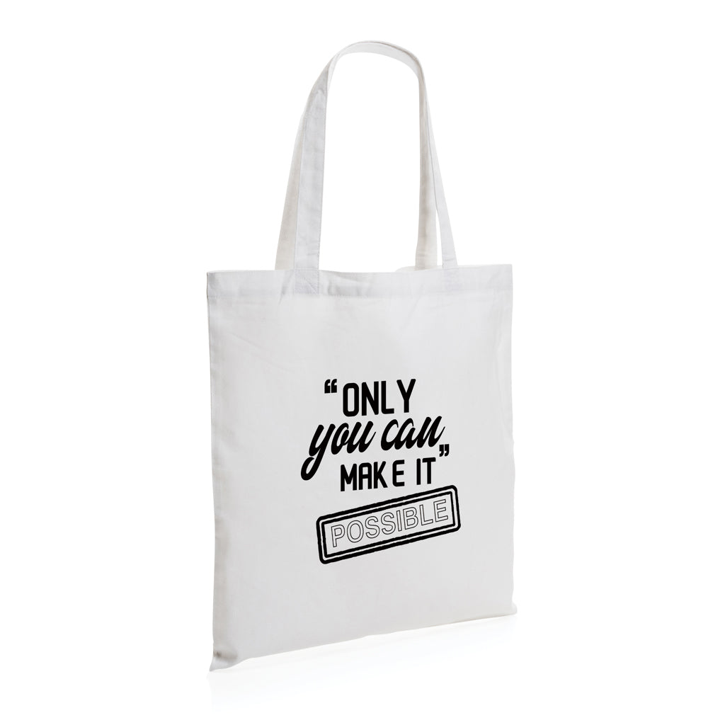 Tell a true story about sustainability and wear it with pride! This versatile 145g cotton totebag is embedded with AWARE™ tracer technology. With AWARE™, the use of genuine recycled fabric materials (70% rcotton and 30% rpet) and water reduction impact claims are guaranteed. Save water and use genuine recycled fabrics. If you choose this item you save between 465 and 531 litres of water, depending on the colour version. With the focus on water, 2% of proceeds of each Impact product sold will be donated to Water.org. Water savings are based on figures when compared to conventional fibre. This calculated indication is based on reliable LCA data as published by Textile Exchange in their Material Snapshots 2016.