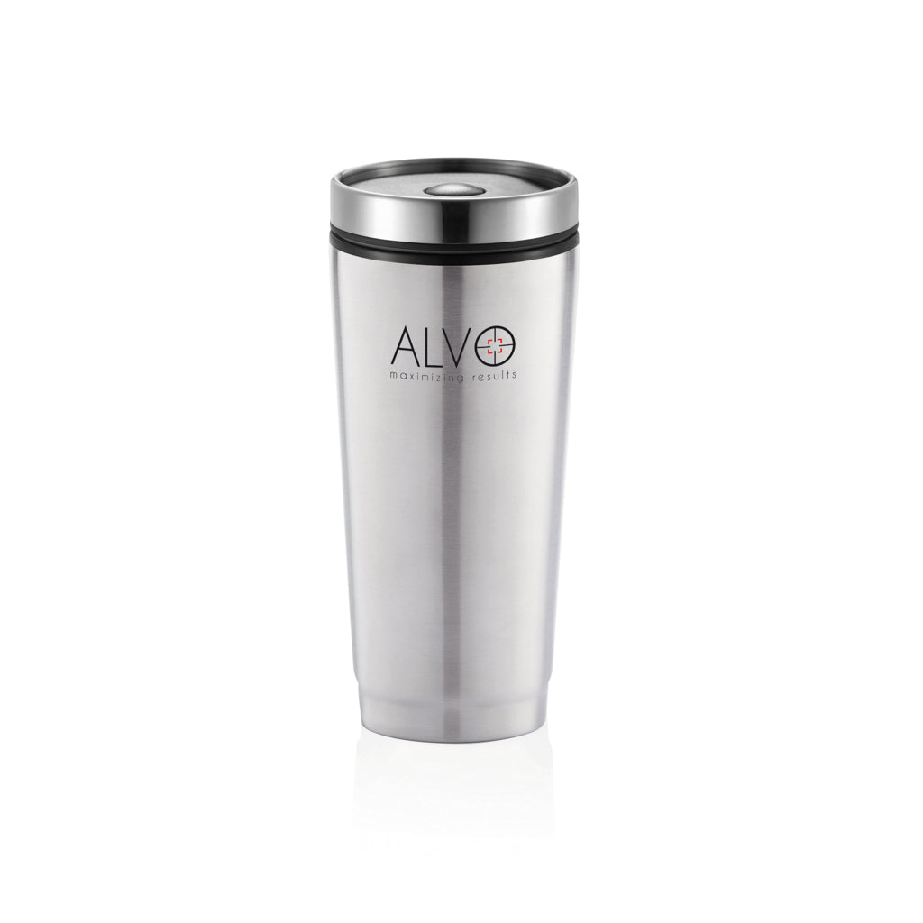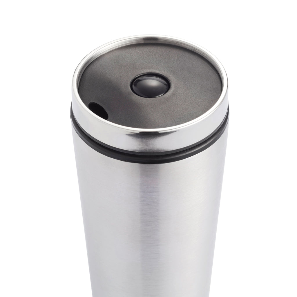 350ml stainless steel outside and PP inside tumbler with screw on lid and unique push button closure to prevent spilling. Suitable for single hand operation. Registered design®