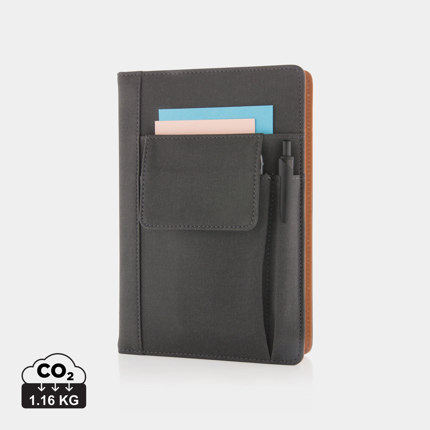 Coated PU notebook cover with a front phone pocket (14 x 10cm), pen pocket and one main pocket . Black page divider and 160 pages of 80g/m2 paper inside. This notebook cover can be re-used with new A5 notebook paper for endless writing.