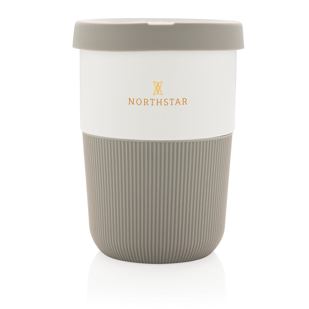 A sustainable alternative to traditional cups! Bringing style and practicality to your morning commute, this PLA coffee cup is ideal for transporting your favourite hot beverage. Manufactured from plant material (PLA), so not only stylish but also kind for the planet. Comes with a silicone grip and lid for your convenience. 100% melamine free. Capacity 380ml.