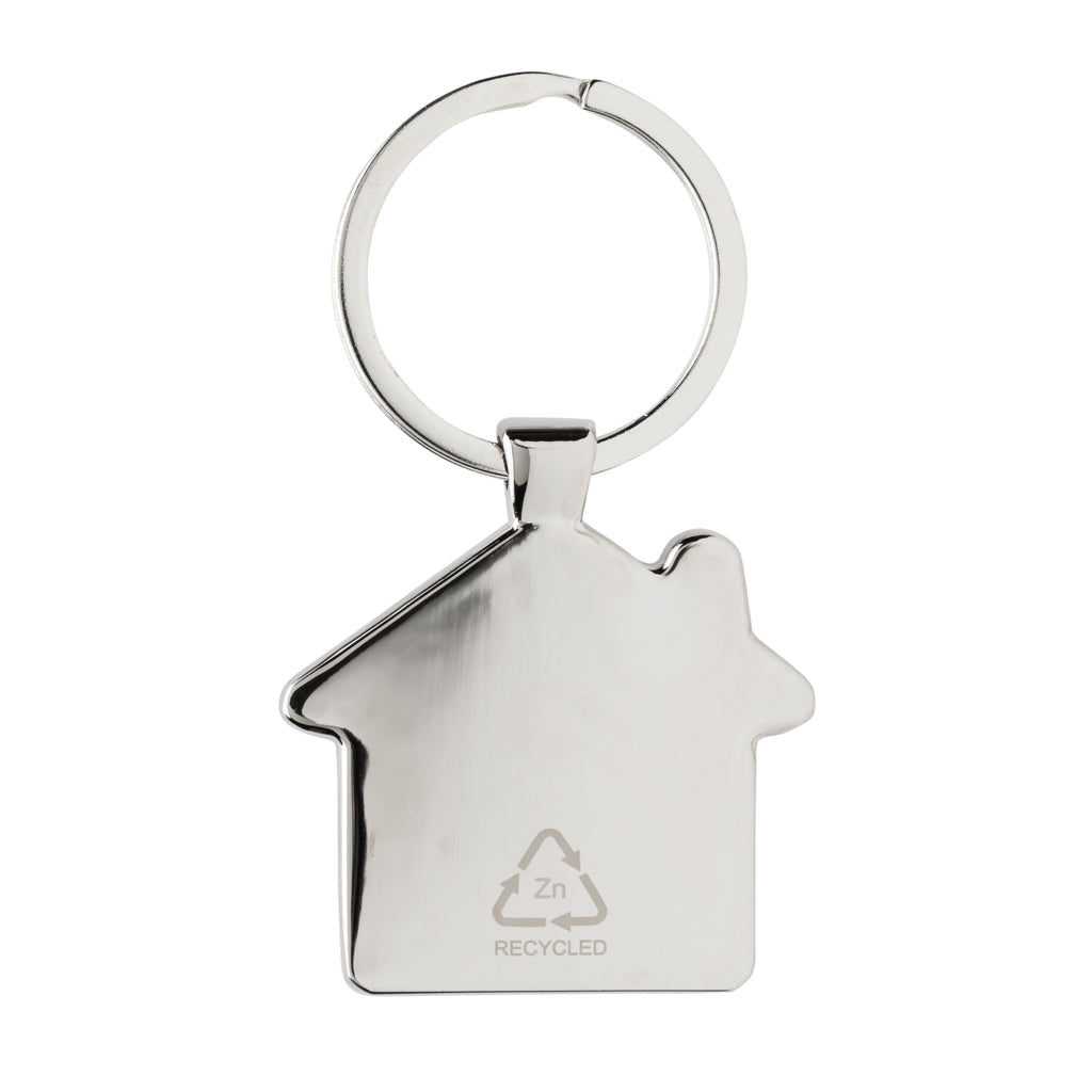 House shape keychain with made with RCS recycled zinc alloy and bamboo. Total recycled content: 76% based on total item weight. RCS certification ensures a completely certified supply chain of the recycled materials. Packed in paper bag.