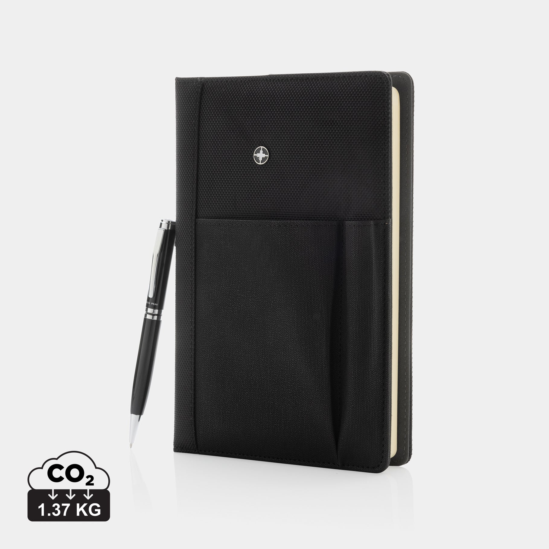 Executive 1680D and 600D polyester notebook cover with pen. Including removable notebook with 192 pages of 80g/m2 paper inside. Pocket on the cover can hold pen, cards, cash, mobile phone etc. Packed in Swiss Peak giftbox.