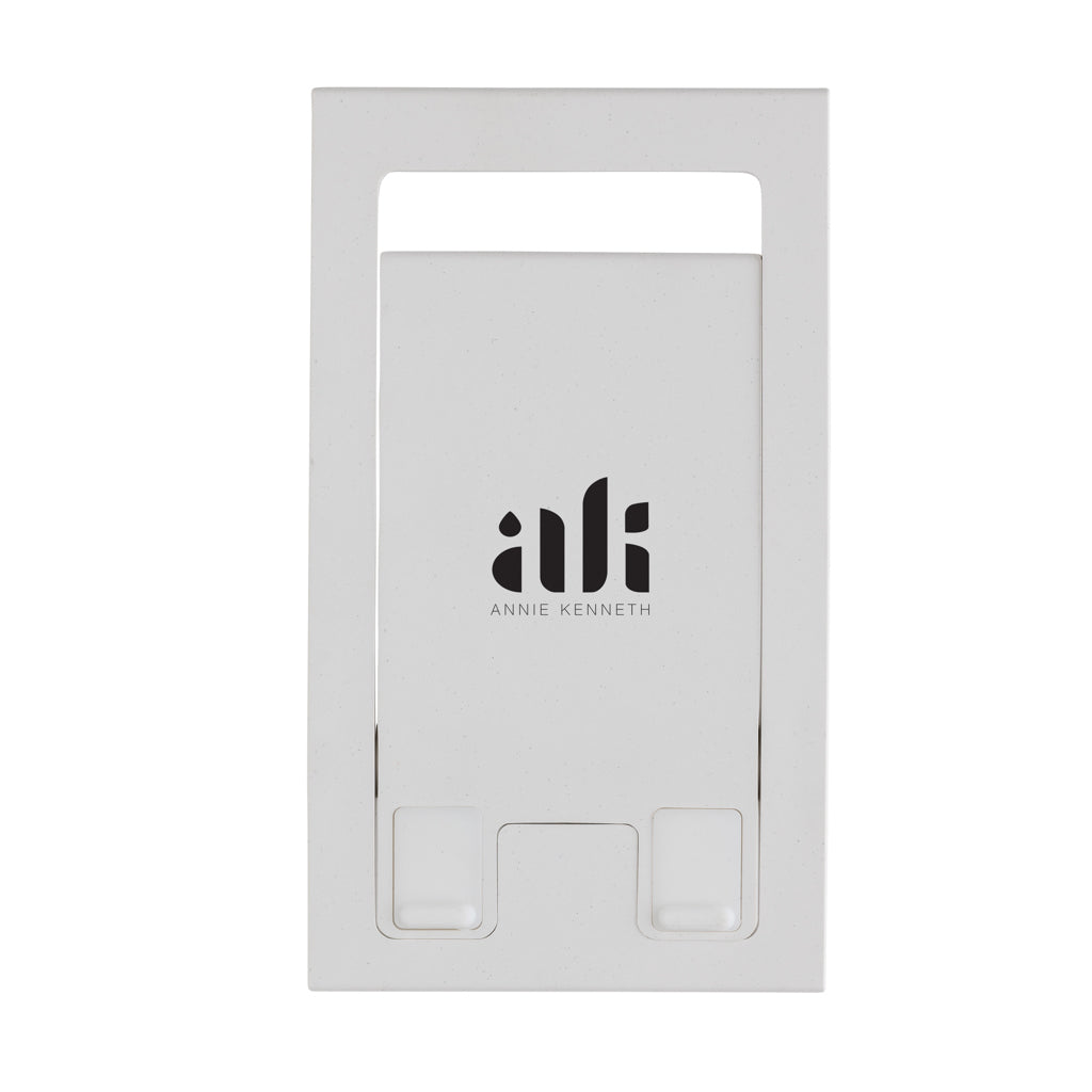 Flat and foldable phone stand made from RCS recycled ABS. The stand comes flat and folded and can be unfolded into a phone stand that can carry all size phones. The stand is strong enough to adjust the viewing angle. With silicon cushioning to keep your phone in optimal condition. Total recycled content: 85% based on total item weight. RCS certification ensures a completely certified supply chain of the recycled materials. Packed in FSC® packaging. PVC Free.