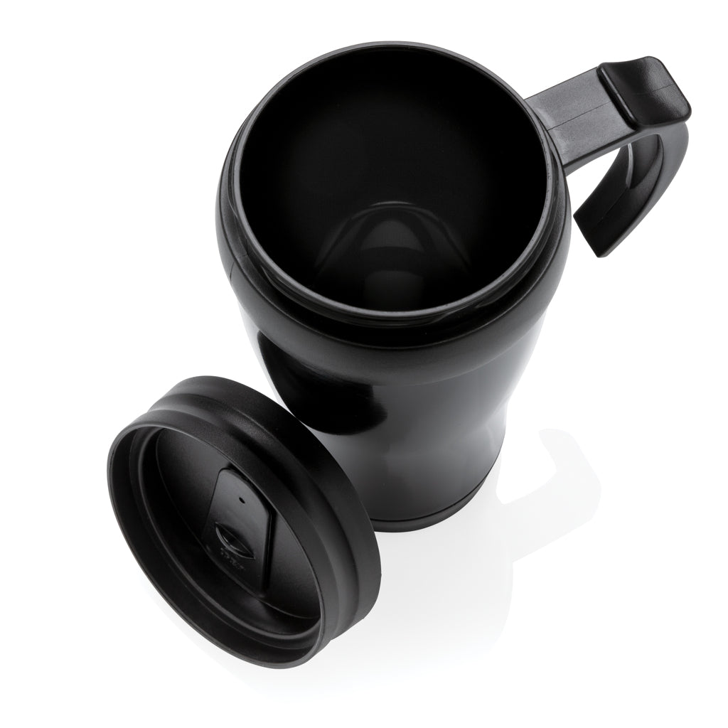 350ml stainless steel outside and PP inside mug with lid and base in black.