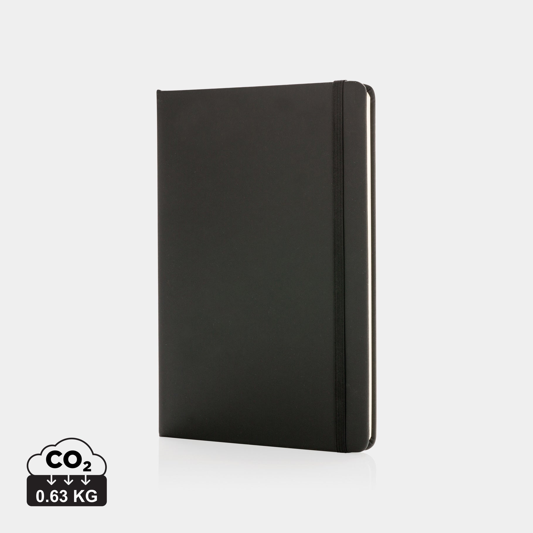 Ruled A5 hardcover PU classic notebook with elastic closure and black bookmark ribbon. 144 pages of 70g/m2 paper inside. Cream coloured pages.