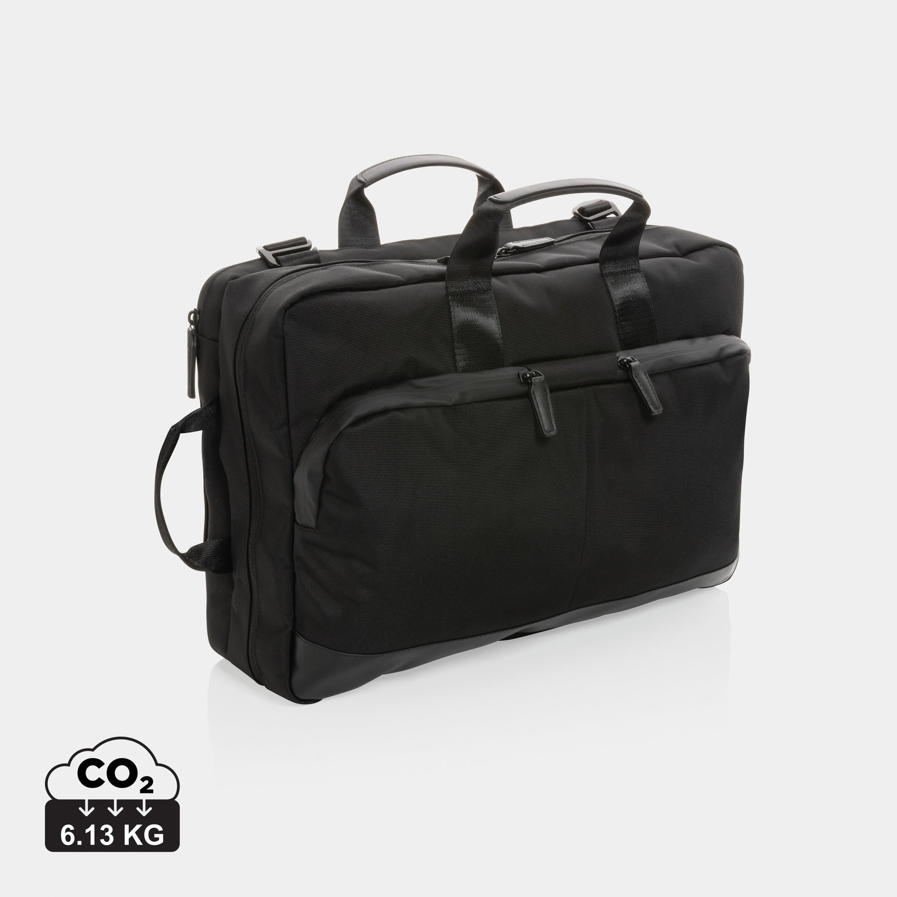 Maximum function in minimalist form, the Swiss Peak 2-in 1 executive laptop bag is a clever 2-way carry that combines the best of briefcase and backpack all in one. The backpack-briefcase hybrid maneuvers with equal ease as a briefcase or backpack and switches between each. Full of features, it includes 2 front pockets, multiple interior pockets, a separate padded 15.6 inch laptop compartment and a roomy compartment for overnight trips. Complete with a concealed luggage sleeve for carry-ons, this versatile companion is an all-in-one solution for all your journeys. With AWARE™ tracer that validates the genuine use of recycled materials. Each bag has reused 49.3 PET bottles. 2% of proceeds of each Aware™ product sold will be donated to Water.org.