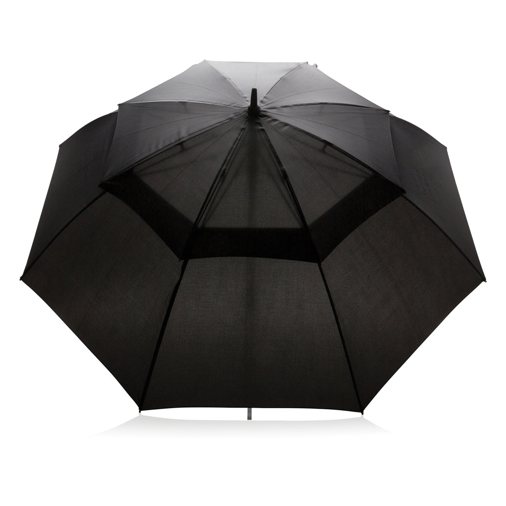 This Swiss Peak AWARE™ Tornado 30" storm umbrella is durable and reliable made with a metal frame, fibreglass ribs and a rubber handle. It has a storm proof function for harsh weather and comes with a Swiss Peak pouch for easy storage. Auto-open and manual close. Additionally, the umbrella features an AWARE™ tracer that validates the use of recycled materials, making it the better choice. Plus, 2% of proceeds from each Aware™ product sold are donated to Water.org.