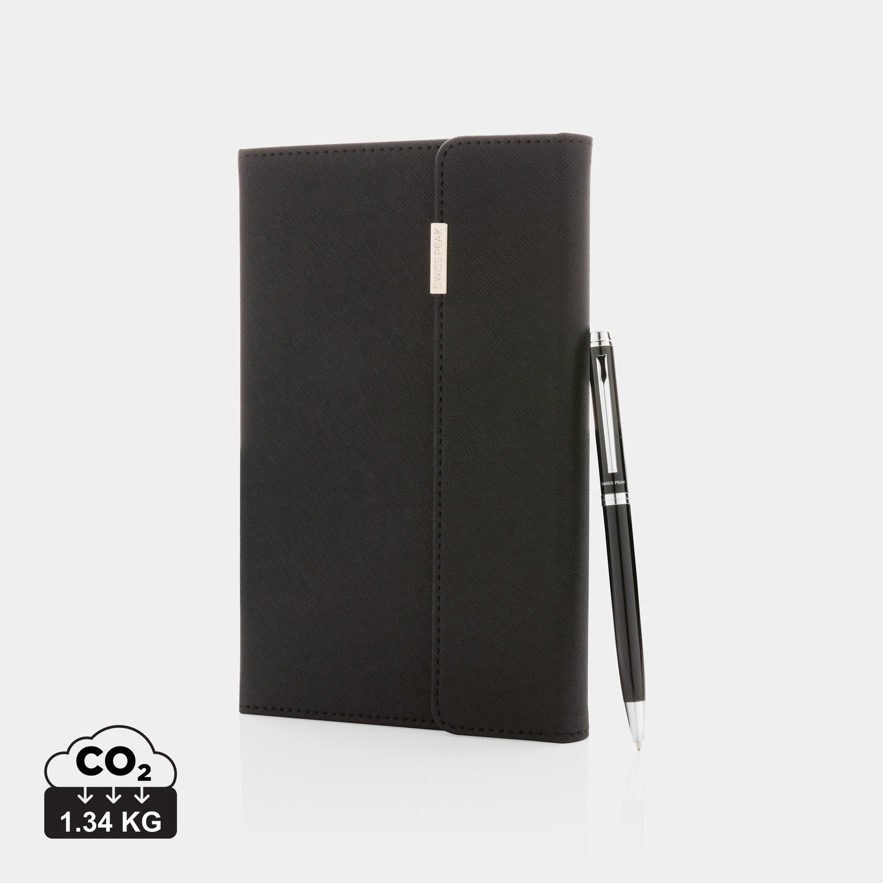 This notebook and pen set is a fantastic choice for those wanting to look sleek and sophisticated at the office. The notebook features a rich texture PU cover with metal logo, with 80 sheets/160 pages 80 grms lined cream coloured paper. The pen comes with German ink and offers 1200 metre writing length. Packed in luxury sleeve gift box.