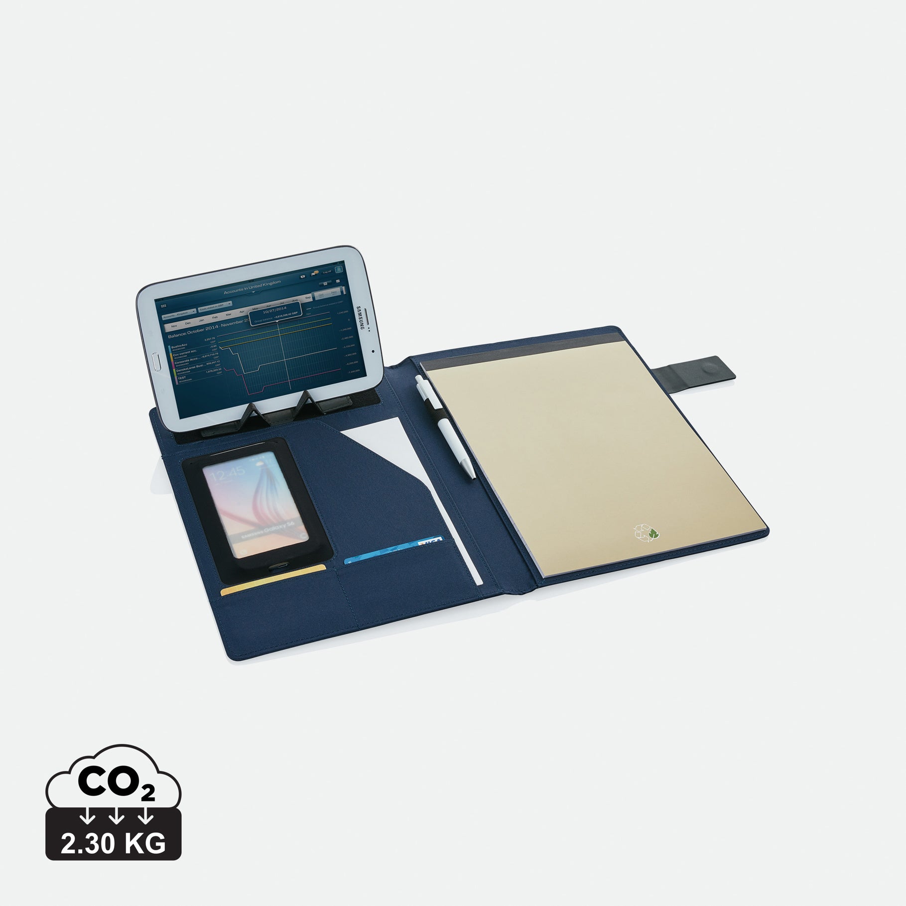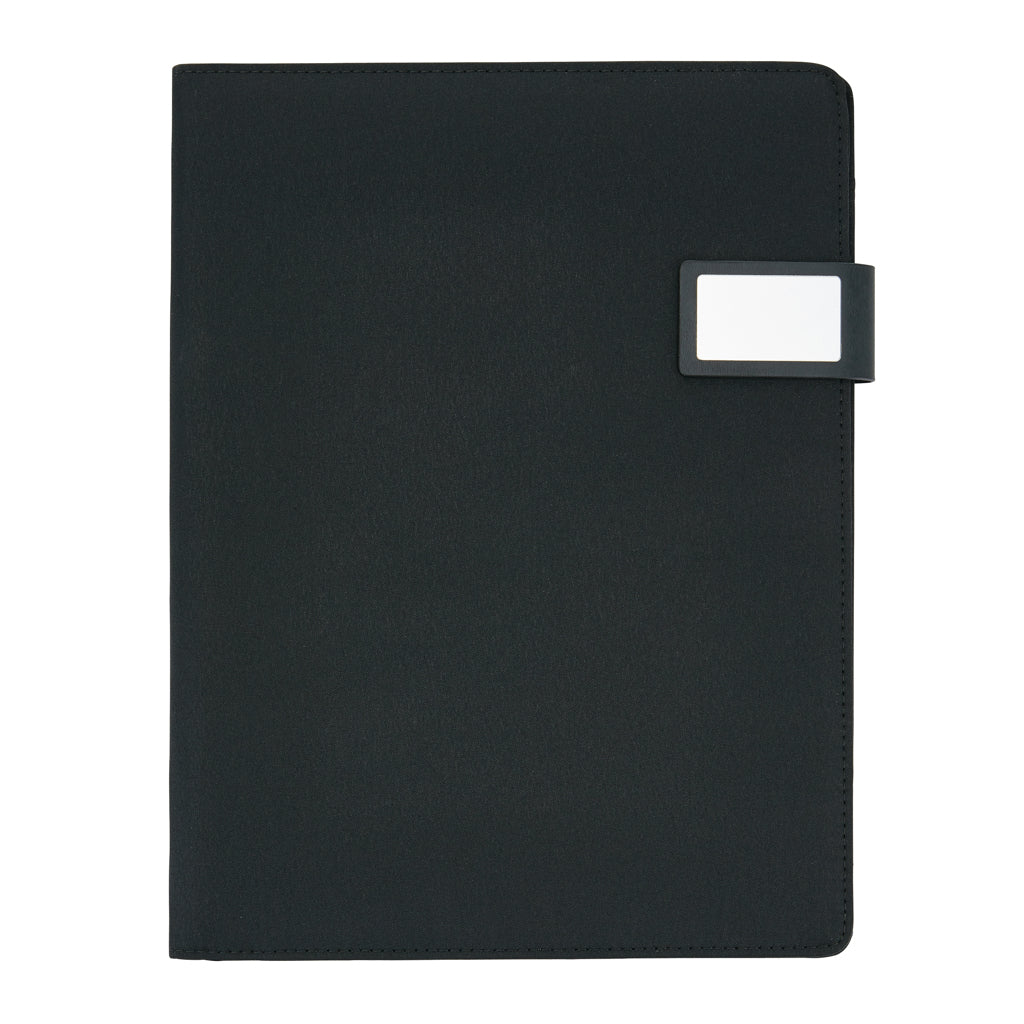 A4 tech portfolio with luxury magnetic metal closure. Inside: a tablet/phone stand, phone holder with see-through window which allows you to view and access your device. Suitable for most common phones. With sleeve for documents, 2 card holders and pen loop. Including recycled A4 notepad.