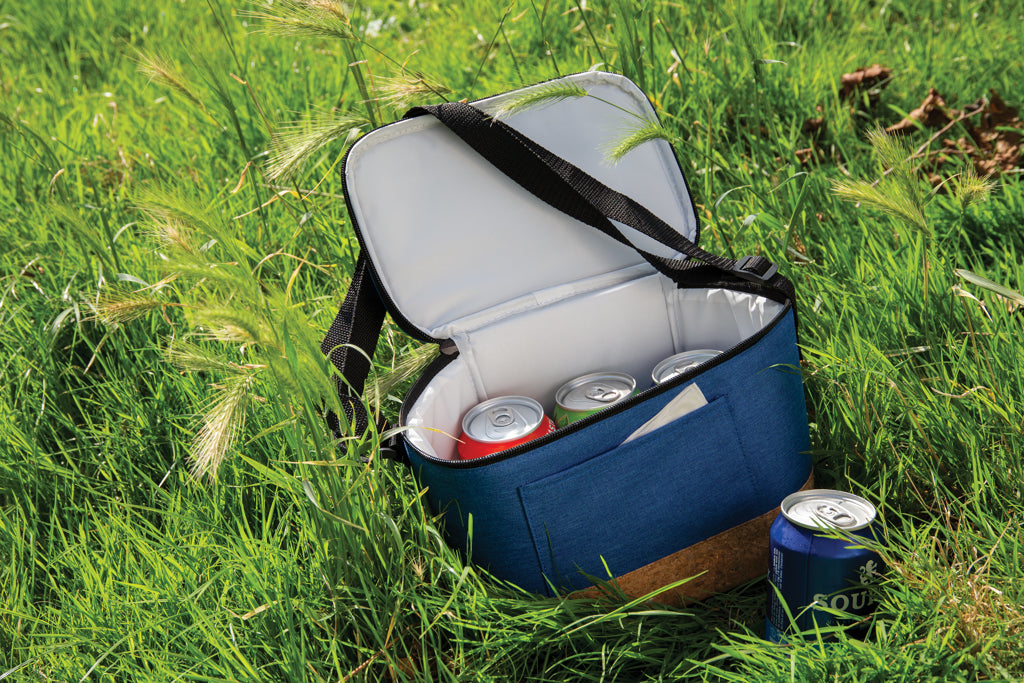 Keep your food and drinks cool until you are ready to use them in this beautiful two tone cooler bag with cork detail. This cooler bag can fit up to 6 cans. Including shoulder strap for versatile carrying options.