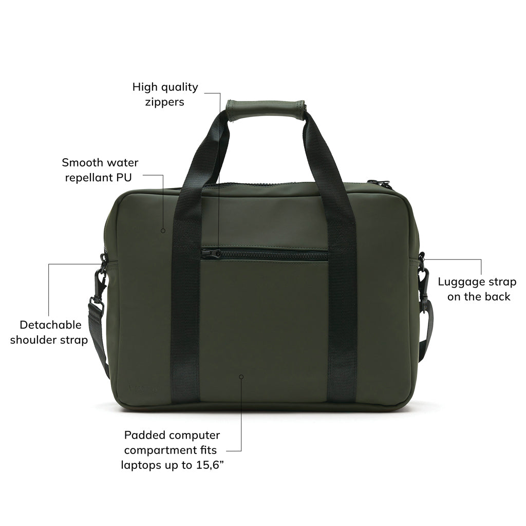 Modern and clean design computerbag. Functions and form comes together, besides the ordinary computer pocket this bag also has place for pens, documents and other belongings. The bag is produced in a water repellent material, with both shoulder strap and carry handles. It also includes an attached band on the backside, so it fits your trolley when travelling.Suitable for computers with an overall size of 17 inches. Please note that the dimensions of the display are not the same as the dimensions of the entire computer.