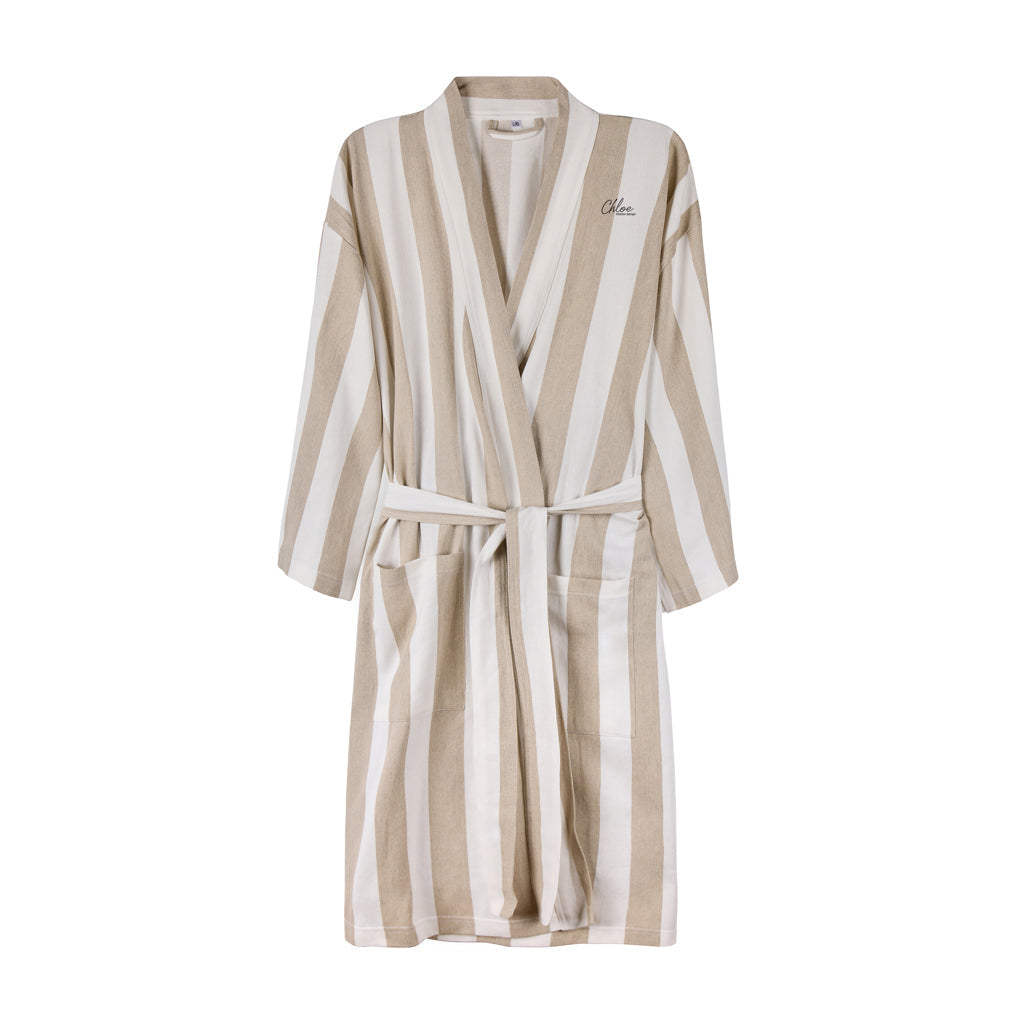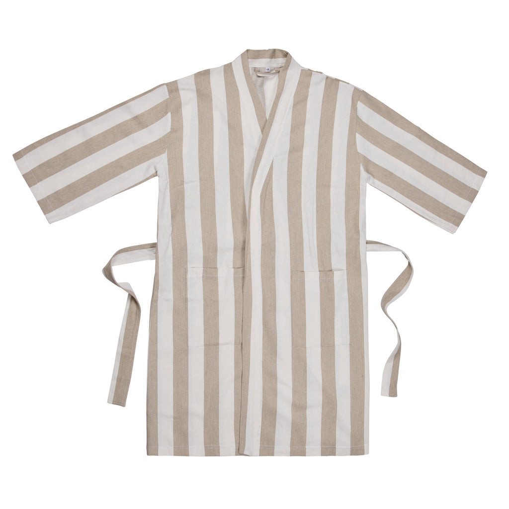 Bring this soft and comfortable hammam robe to the beach or simply enjoy it at home. Crafted from a lightweight and airy 200 gsm blend, it combines the comfort of cotton with the quick-drying benefits of polyester. Designed in a classic style with a two-tone striped pattern, it features a neat collar, front pockets, 3/4 sleeves, and a waist belt for a perfect fit. Certified by GRS (Global Recycled Standard), GRS certification guarantees that the entire supply chain of the recycled materials is certified. The total recycled content is based on the overall product weight. This product contains 69% GRS certified recycled cotton and 29% GRS certified recycled polyester.
