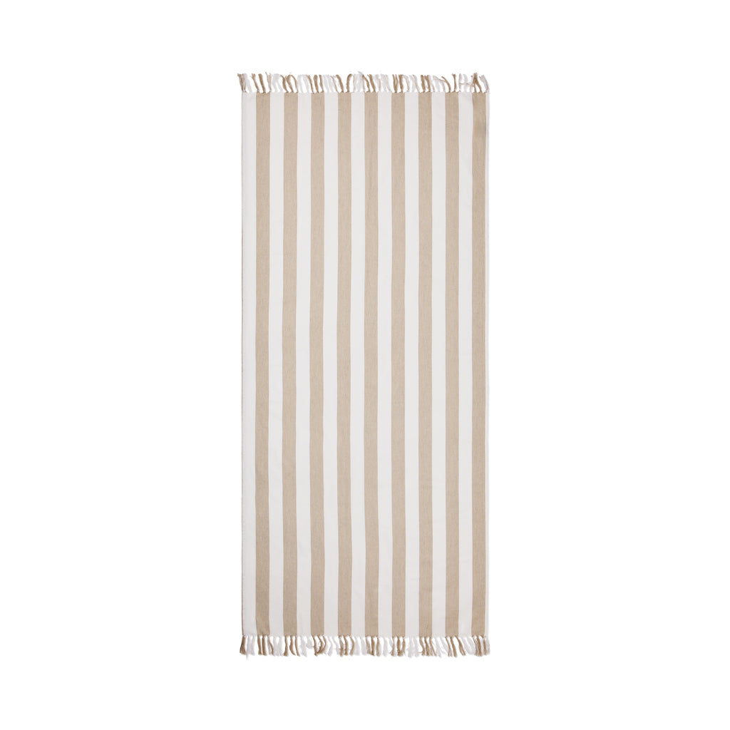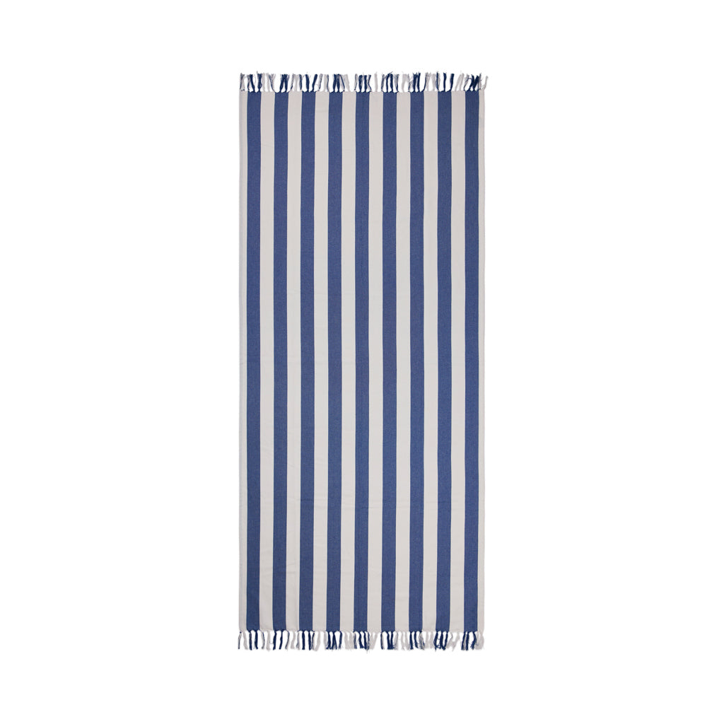 This hammam beach towel features a classic two-coloured striped pattern with fringes on the short sides. Crafted from a lightweight and airy 200 gsm blend, it combines the comfort of cotton with the quick-drying benefits of polyester. Measuring 80x180 cm, it is perfect for the beach or poolside. Certified by GRS (Global Recycled Standard), GRS certification guarantees that the entire supply chain of the recycled materials is certified. The total recycled content is based on the overall product weight. This product contains 68% GRS certified recycled cotton and 29% GRS certified recycled polyester.