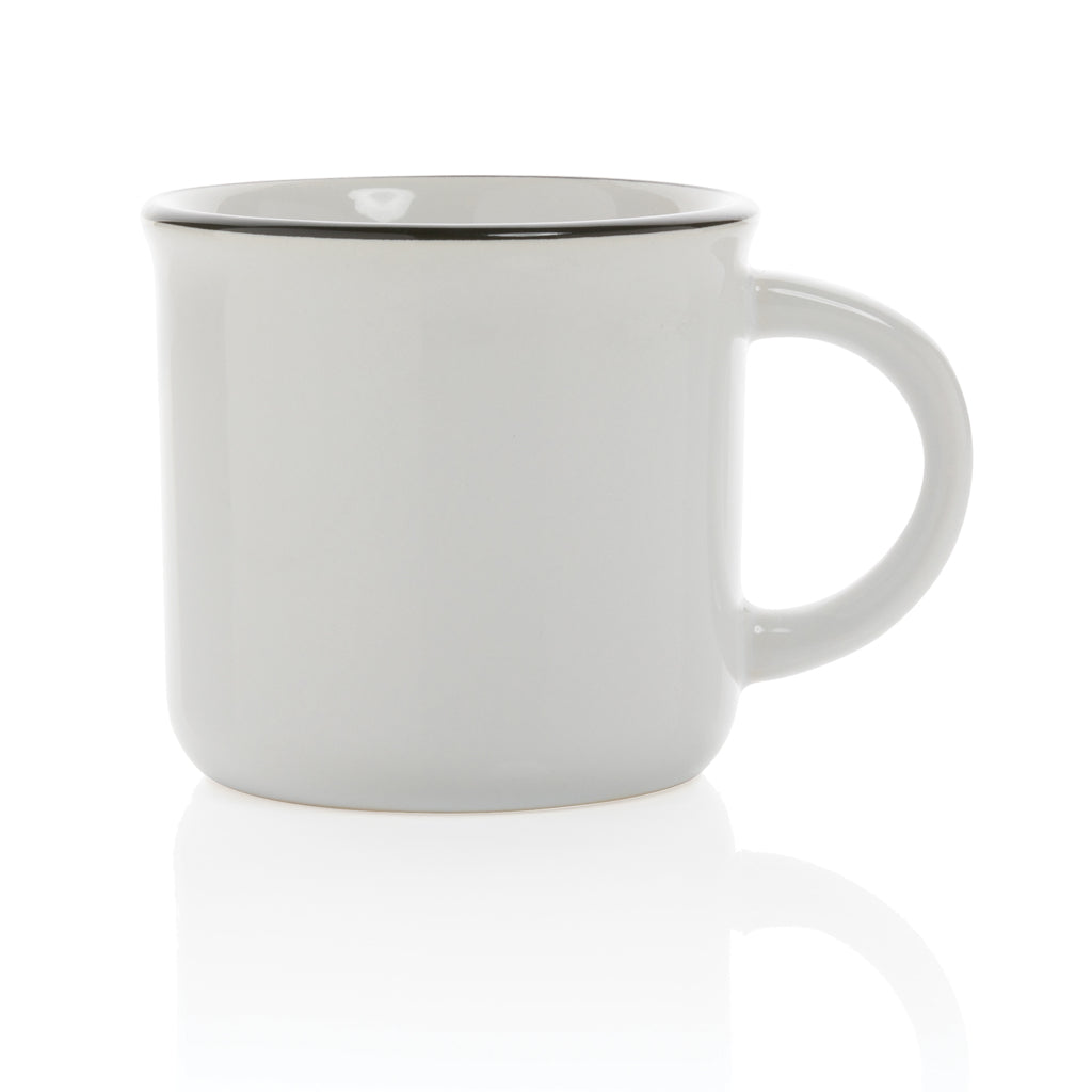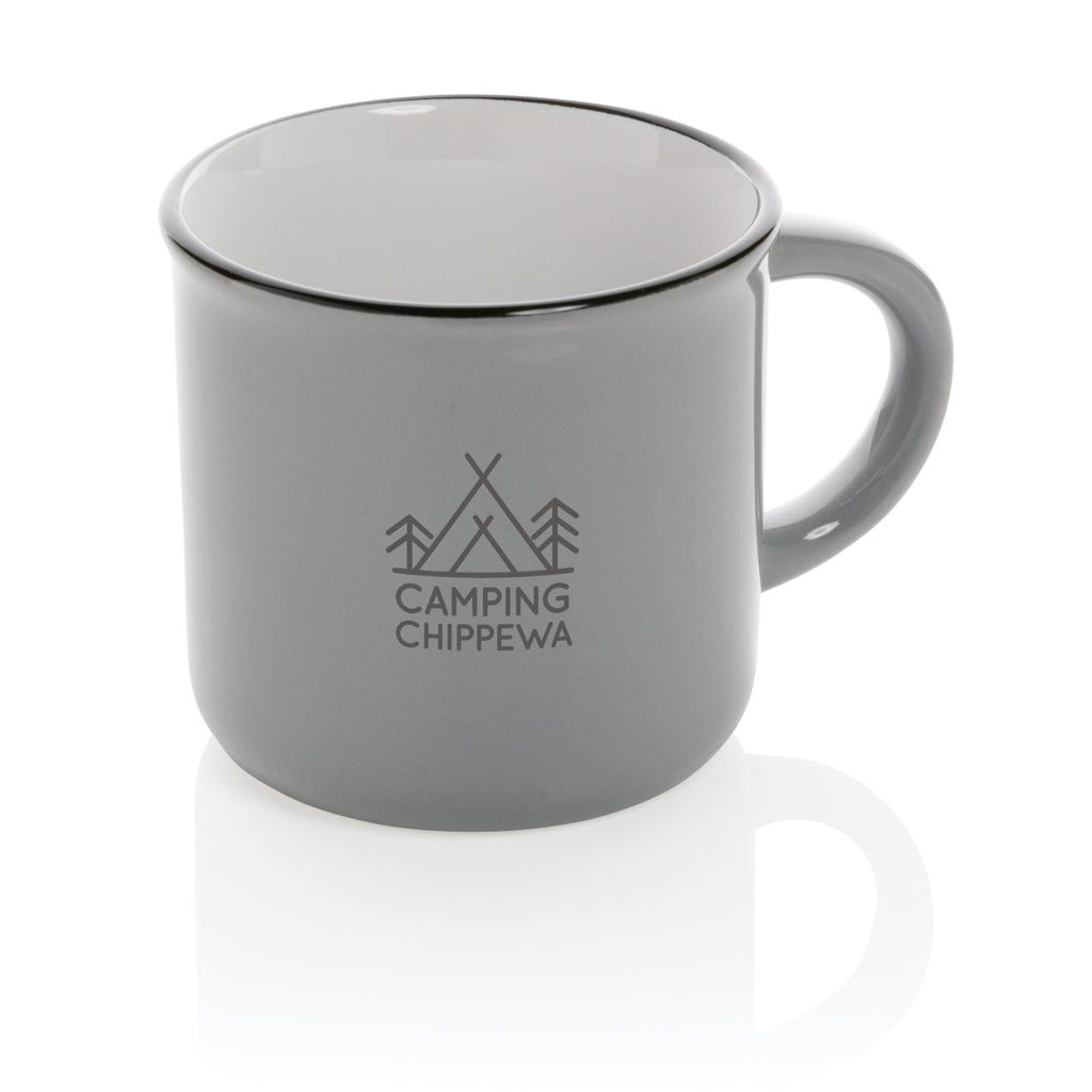 This mug is made from ceramic for durability and lasting use. The mug has a vintage look and features a curved handle for easy grip. Dishwasher safe in accordance with EN12875-1 (at least 125 washing cycles) for all decoration methods. Packed in gift box. Capacity 280ml.