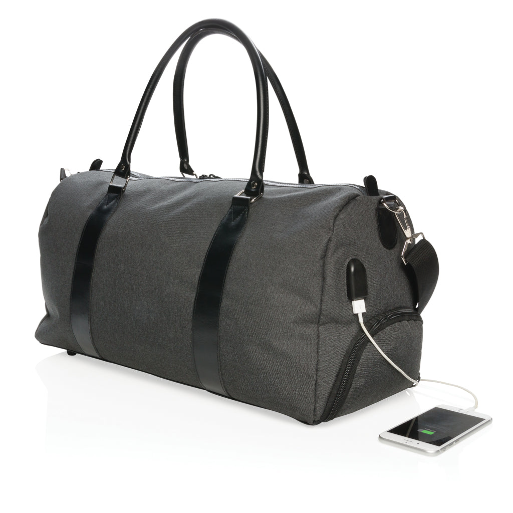 Modern and minimalist 600D polyester weekend bag with PU handles & comfortable shoulder strap. Large main compartment with plenty of room for your weekend necessities or sports gear. Connect your powerbank easily to the integrated USB A charging port and charge your phone or tablet whilst on the go. Also comes with quick access pocket on the right. PVC free.