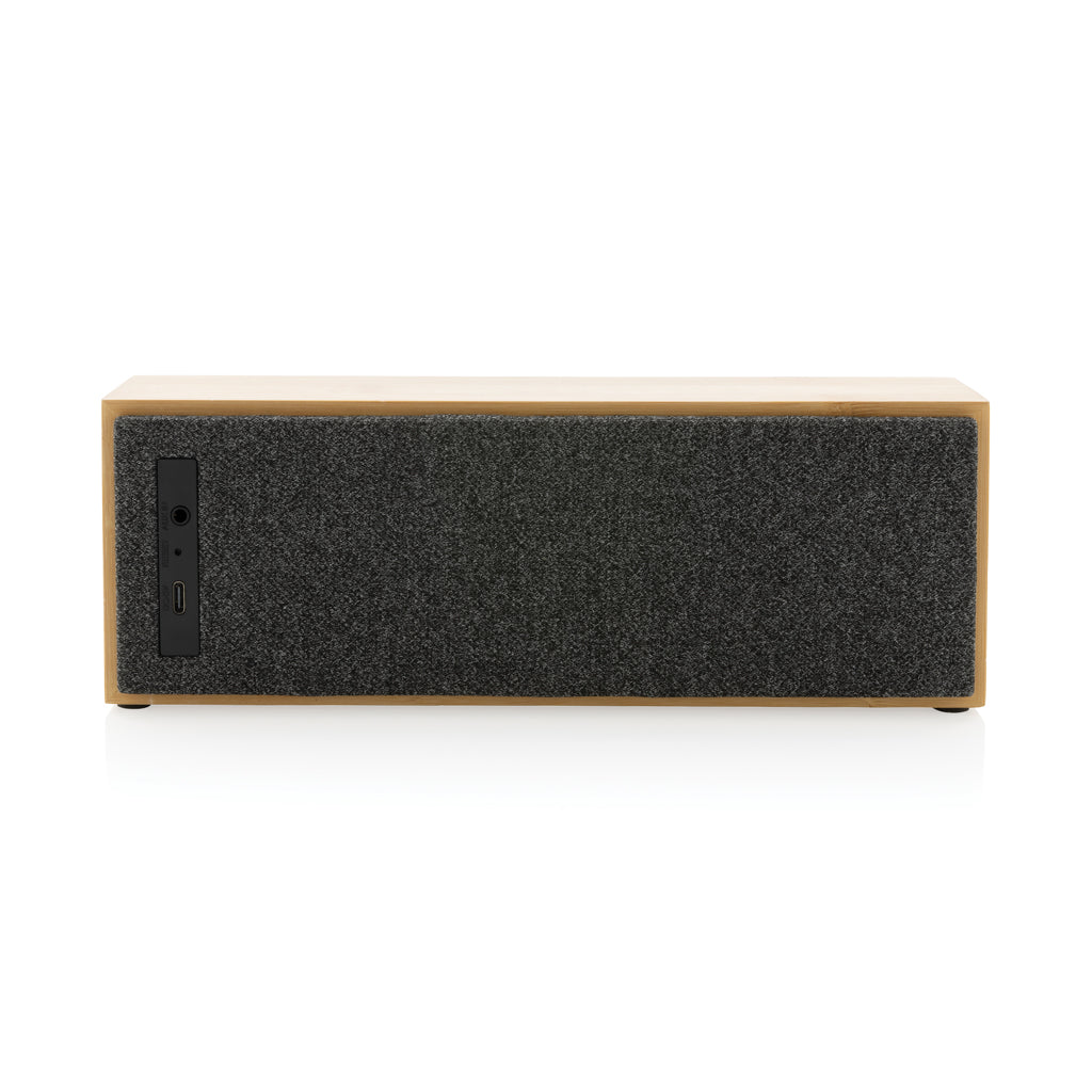 Luxury 10W speaker with clear sound and strong bass. The outer casing is made from FSC 100% certified bamboo. The plastic components are made with RCS (Recycled Claim Standard) certified recycled ABS. Total recycled content: 23 % based on total item weight. RCS certification ensures a completely certified supply chain of the recycled materials. The speaker comes with BT 5.1 for easy and smooth operation up to 10 metres and low power consumption. The 2000 mah battery allows a playtime up to 6 hours and can be fully re-charged in 3 hours. With pick up function and mic to answer (video) calls. Packed if FSC mix kraft box. Including RCS certified recycled TPE charging cable.