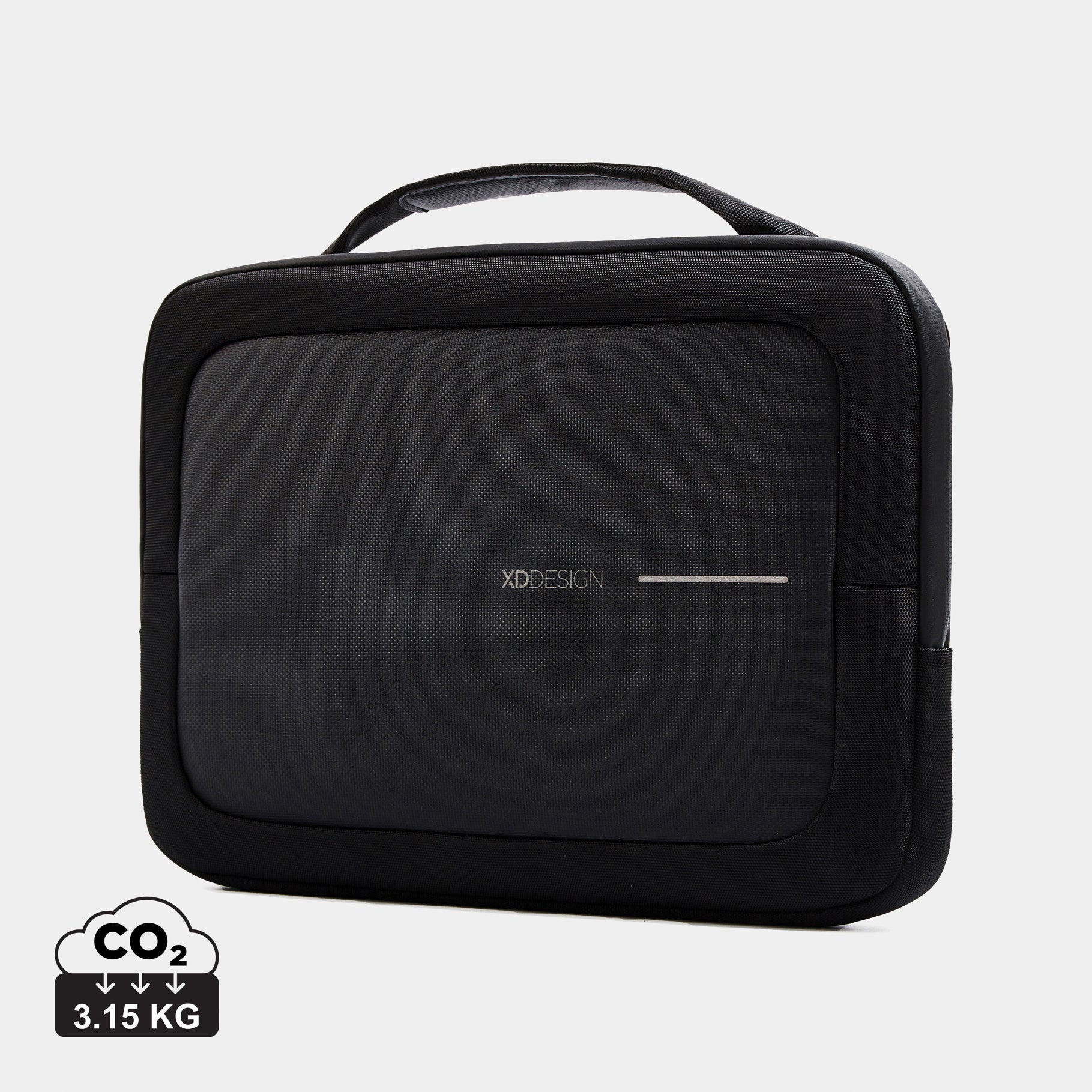 The XD Design 16" Laptop Bag offers reliable laptop protection. Crafted from R-pet 1200D fabric and textured PU, it features a water-repellent finish. The top handle and shoulder strap provide versatile carrying options, while the rear pocket offers convenient storage for essential items. The waterproof zipper and textured fleece lining add an extra layer of resilience. Made from R-pet fabric with the AWARE™ tracer. With AWARE™, the use of genuine recycled fabric is guaranteed. 16% recycled content.